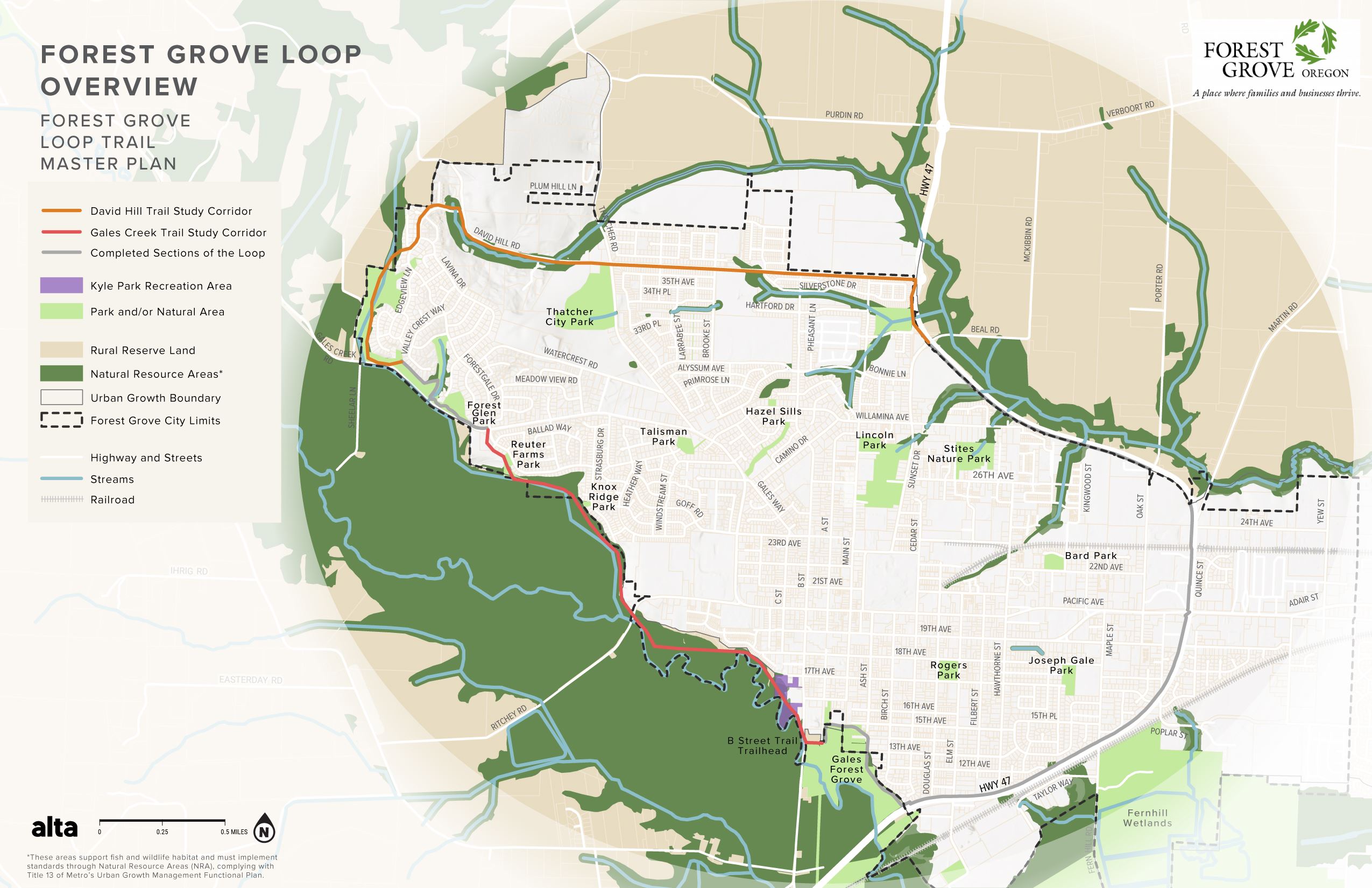 The City of Forest Grove adopted the Parks, Recreation, and Open Space Master Plan in 2016 which outlined the concept for the Forest Grove Loop Trail. The Forest Grove Loop Trail Master Plan will develop community-supported plans that will form the basis for the preparation of construction documents when the trail is developed. The Forest Grove Loop Trail Master Plan will include two proposed segments: