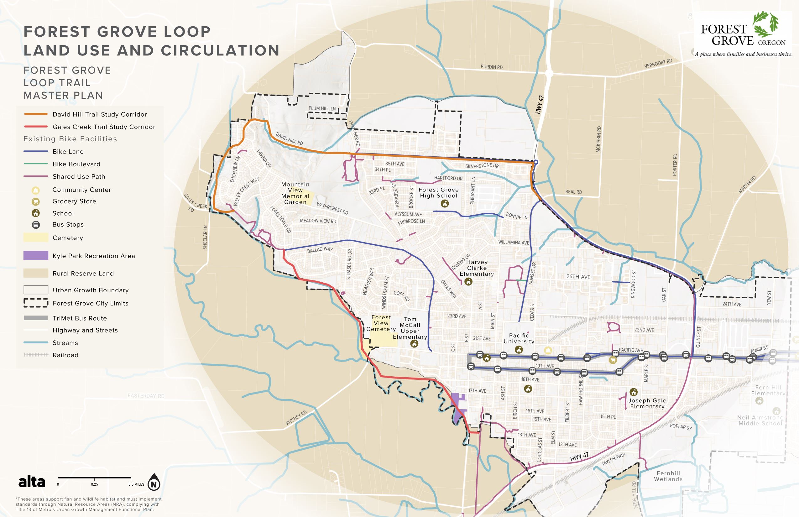 At the regional level, the two segments of the Forest Grove Loop Trail will be part of the Emerald Necklace trail which connects to the proposed multi-use Council Creek Trail on the eastern edge of the City providing a connection to Cornelius and Hillsboro. Within the City, Forest Grove Loop Trail connects with Old Town Loop Trail and Highway 47 Trail.