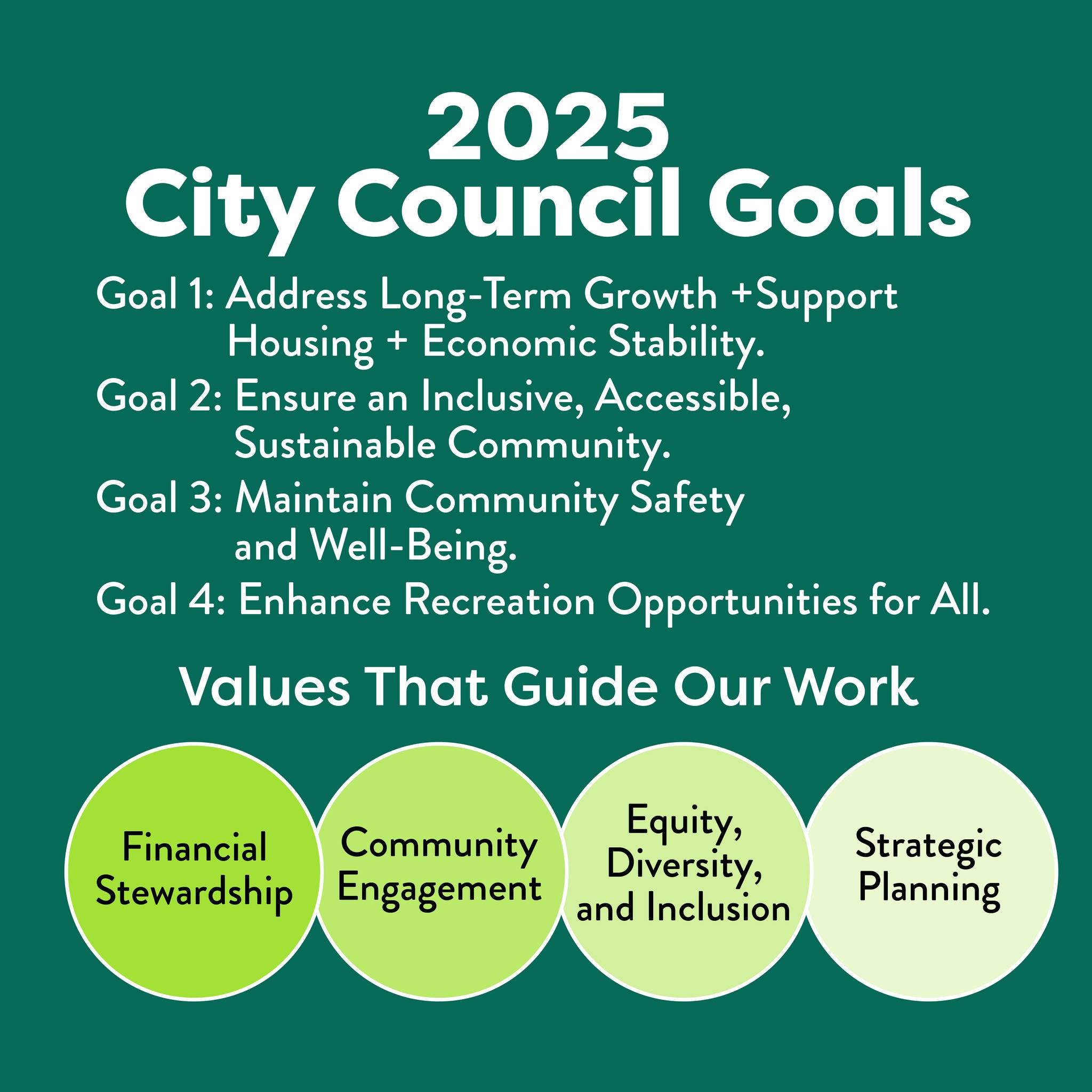 With a focus on long-term growth, accessibility, safety, and recreation, this year’s priorities aim to support community members and businesses while ensuring our city remains a great place to live, work, and play.  Four pillars were identified under our established values of financial stewardship, community engagement, DEI, and strategic planning.